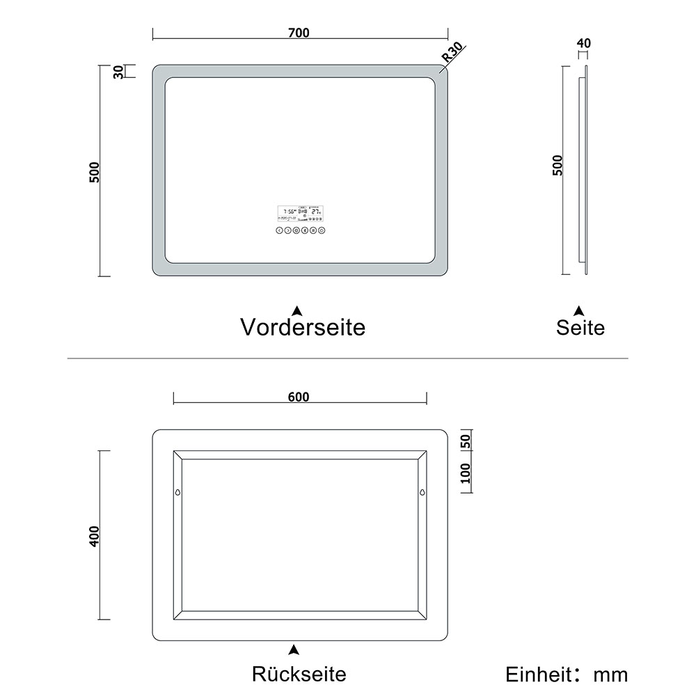 70×50cm LED Badspiegel mit Bluetooth, Kalt/Warmweiß, Touch Beschlagfrei[Typ J]