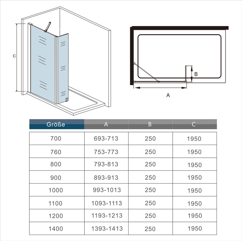 8mm ESG Sicherheitsglas | Höhe: 195cm | Ohne Duschtasse